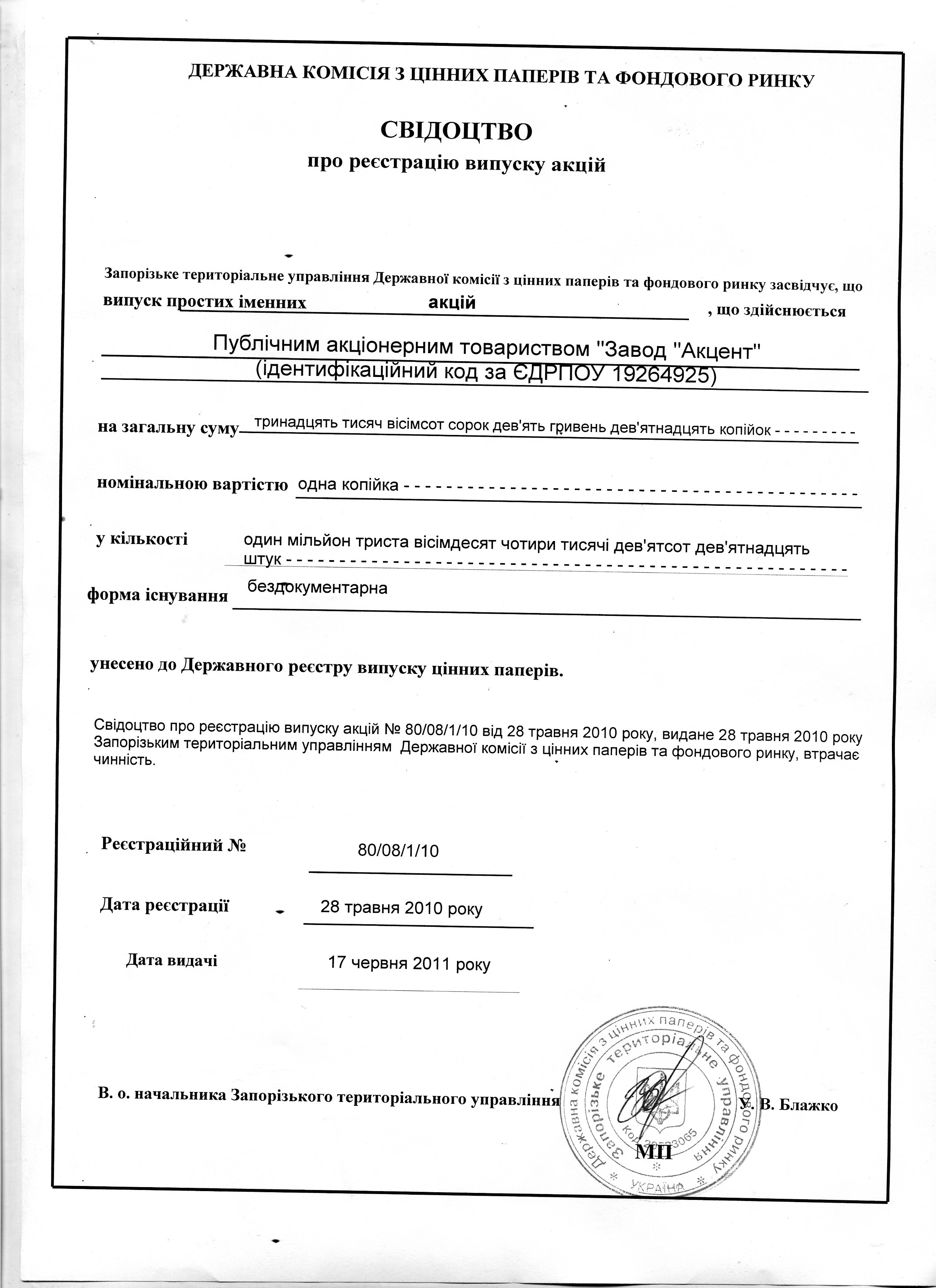 Свідоцтво реєстрації випуска (розміщено 28.06.2011)